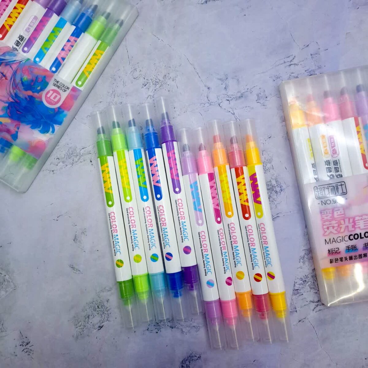 این ماژیک هایلایت دارای یک سر تخت برای هایلایت کردن و یک سر سفید برای نوشتن و یا تغییر دادن رنگ هایلایت هست. به این شکل که اگر پس از هایلایت کردن یک متن، با سر سفید روی آن بکشید رنگ هایلایت تغییر میکند. همین طور اگر با سر سفید شروع به نوشتن کنید، یک نوشته نامرئی دارید که اگر با سر تخت ماژیک هایلایت روی آن بکشید نوشته های شما ظاهر میشود. به طور کلی این ماژیک هایلایت 20 رنگ متفاوت و جذاب رو در اختیار شما قرار میذاره. مشخصات ماژیک هایلایت جادویی 10 رنگ تعداد ماژیک داخل هر بسته: 10 رنگ مختلف نوع ماژیک: ماژیک هایلایت دو سر (یک سر رنگی و یک سر سفید) ارتفاع ماژیک: 14.5 سانتی متر